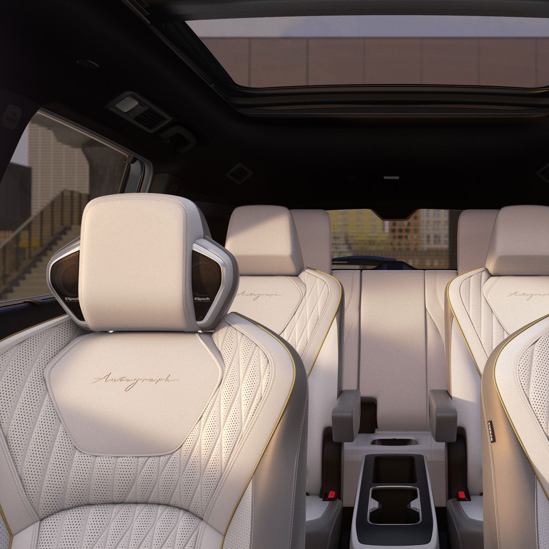 • Quilted semi-aniline leather-appointed first-and-second-row seating with contrast stitching and massaging first-row seating