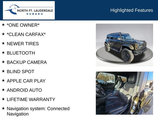 Designed to conquer the great outdoors, the Bronco Raptor is equipped with a host of off-road-focused features, including beadlock-capable forged wheels, Raptor side and hood graphics, and a Marine Grade Vinyl interior that can handle the elements. The intuitive SYNC 4 infotainment system, complete with Connected Navigation, Apple CarPlay, and Android Auto, ensures you stay connected and entertained on every adventure.